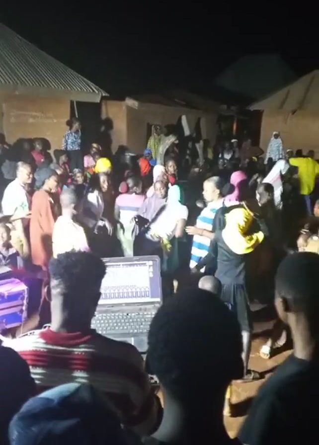 In a dimly lit outdoor space, a group of people, mostly dressed in casual clothing, are gathered and dancing. The scene is observed from behind a laptop computer and audio mixing equipment, suggesting the presence of a DJ or sound technician. The crowd includes individuals of varying ages, with some wearing head coverings. The environment seems to be a village or rural area, with simple buildings visible in the background. The primary activity is dancing, with the crowd swaying and moving to the music. The overall atmosphere appears festive.