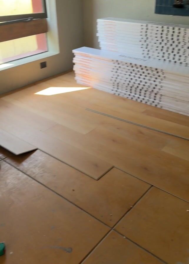 person installing laminate flooring in a room