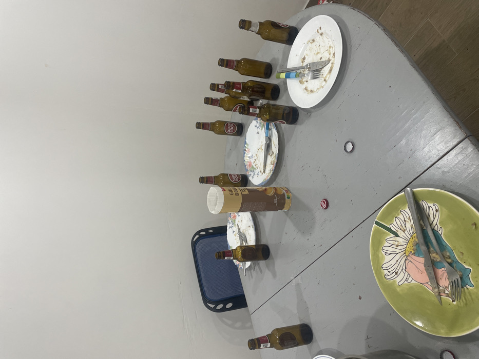 A messy gray table displays remnants of a gathering. Empty Super Bock beer bottles are scattered across the surface, alongside dirty plates containing leftover food and utensils. A Pringles can lies on its side. The setting implies a casual, recently concluded social event, leaving behind the expected traces of food, drink, and minimal cleanup.
