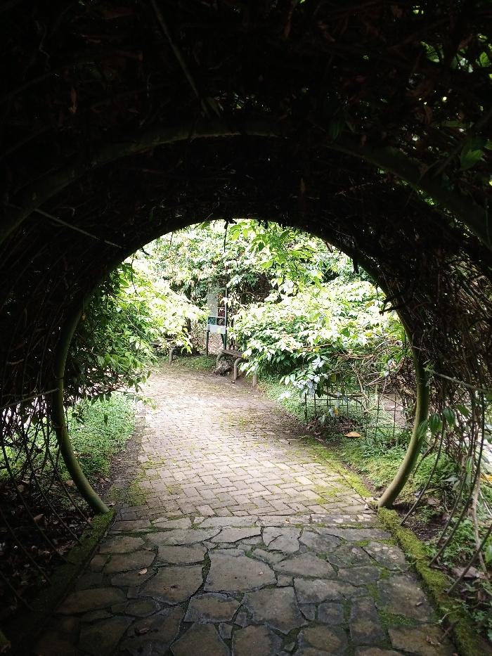 A stone-paved path leads through a tunnel-like circular structure made of branches and foliage