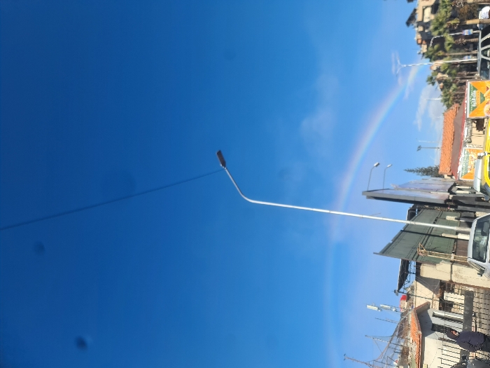 The image displays an outdoor street scene in Barza Municipality, Syria, under a clear blue sky. A partial rainbow is visible, arching across the sky from the left to the right side of the frame. A single thin overhead cable traverses the upper portion of the sky, where several circular lens artifacts are also present. In the midground, a tall, white street lamp post equipped with an LED light fixture extends vertically towards the sky, positioned slightly left of center. To its immediate left, a person wearing a dark hooded jacket and pants stands beside a dark metal fence. Behind this fence, a building with a light-colored facade and a red-tiled roof is partially visible, topped by a structure comprising metal scaffolding, netting, and multiple communication antennas. To the right of the central lamp post, two large, dark billboards are angled towards the viewer. Below these billboards, a white sedan, a yellow taxi, and a silver SUV/van are present on what appears to be a street. The background to the right features a line of palm trees, additional streetlights, and multiple buildings with red-tiled roofs.