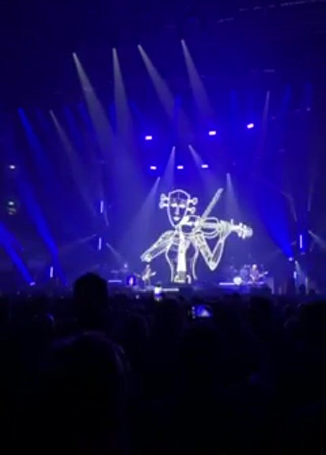 A live concert is underway, viewed from the crowd's perspective. The stage is bathed in intense blue light, highlighted by bright spotlights. A large white screen displays an illustration of a violinist. Several musicians are performing on stage, barely visible due to the distance and lighting. The crowd is silhouetted, with many people holding up phones to record the performance.