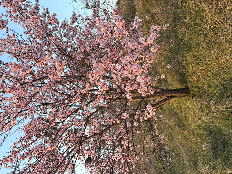 An outdoor scene in Burgas, Bulgaria, features a flowering tree in full bloom. The tree, centrally positioned, possesses a dark, multi-stemmed trunk with branches densely covered in numerous small, light pink blossoms. A red and white braided string is attached to a branch on the left side of the tree. The ground below consists of uneven terrain with a sparse mix of green and dry, brown grass, and scattered fallen pink petals. In the background, additional deciduous trees with bare branches are partially visible. The sky above is clear and light blue. The scene is illuminated by warm, directional light, consistent with late afternoon or early morning conditions.