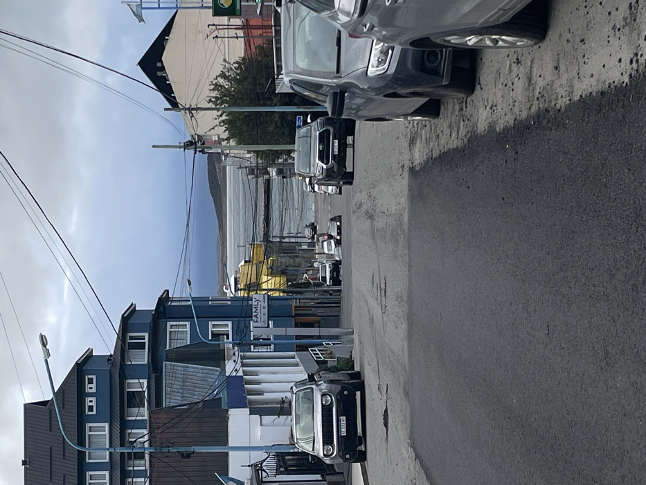 The image depicts a street scene in Ushuaia, Argentina, looking downhill towards the Beagle Channel under an overcast sky