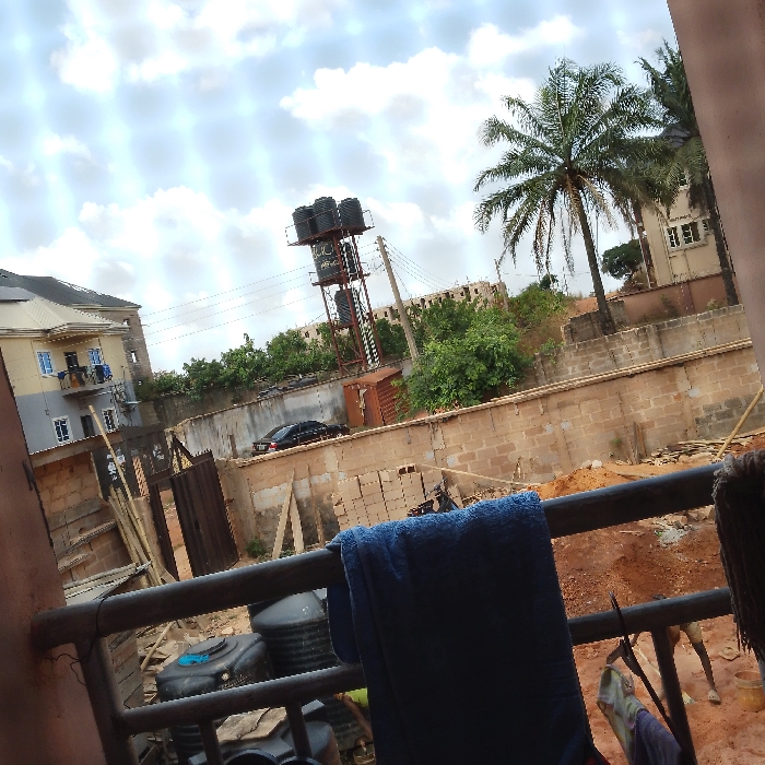 The image depicts an outdoor scene in Nsukka, Nigeria, viewed from an elevated perspective, likely a balcony. In the immediate foreground, a dark blue towel is draped over a black metal balcony railing. To the right, additional articles of clothing, including a striped garment, hang on the railing. Below the railing, several black plastic water storage tanks are visible on the ground. The midground is dominated by a reddish-brown earth construction site, featuring partially constructed brick walls, loose bricks, and wooden scaffolding materials. A narrow road runs behind a section of this wall, where a dark-colored sedan is parked near a small, brown corrugated metal structure. A tall metal structure supports multiple black plastic water tanks, forming a prominent water tower. Overhead power lines traverse the scene, connecting to utility poles. Green foliage and trees are interspersed throughout the area. One individual, partially visible in the lower right portion of the construction site, stands near a yellow bucket with light-colored footwear. In the background, a multi-story building with a cream and grey facade and blue-framed windows stands on the left. On the right, another light-colored multi-story building is partially obscured by a large palm tree. The sky is overcast with scattered white and grey clouds.