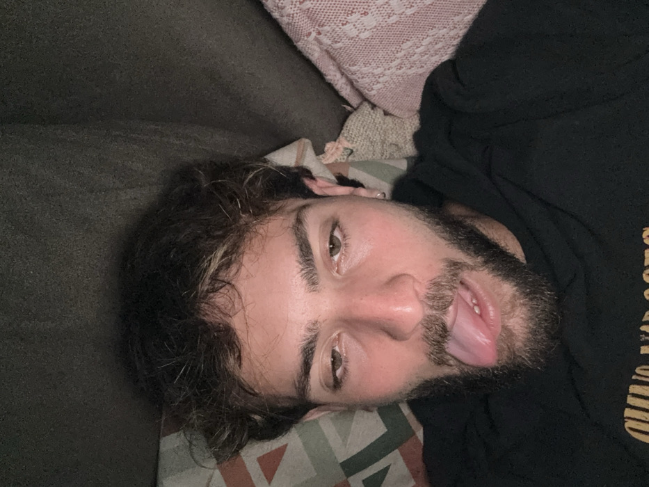The image depicts a close-up of a young adult male in what appears to be an indoor setting in Cairu, Brazil. The subject, positioned centrally, has dark, curly hair with lighter streaks, a full beard, and a mustache. He is wearing a dark-colored hooded garment with an indistinct lighter-colored design visible on the chest area. His eyes are partially closed, with his right eye appearing slightly more closed than his left. His mouth is open, and his tongue is extended downwards and slightly to the left. The background consists of soft furnishings: a pillow or cushion with a geometric pattern to the left, and a light pinkish-beige textured fabric, possibly a blanket or upholstery, to the right. A dark, plain surface, possibly a wall or headboard, occupies the upper background. The scene is dimly lit. No interactions are visible.