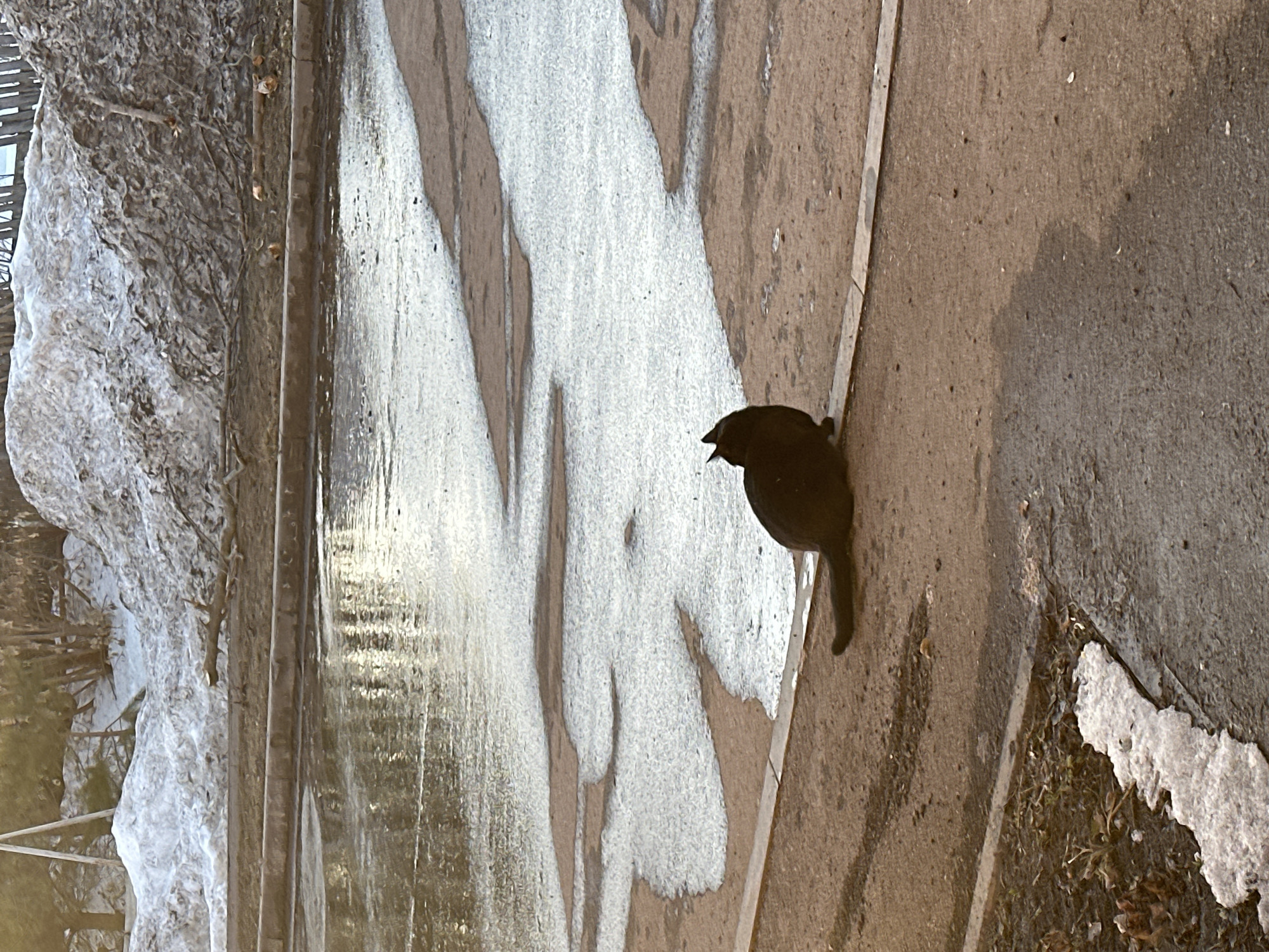 A black bird stands on a sidewalk in what appears to be a thawing winter landscape