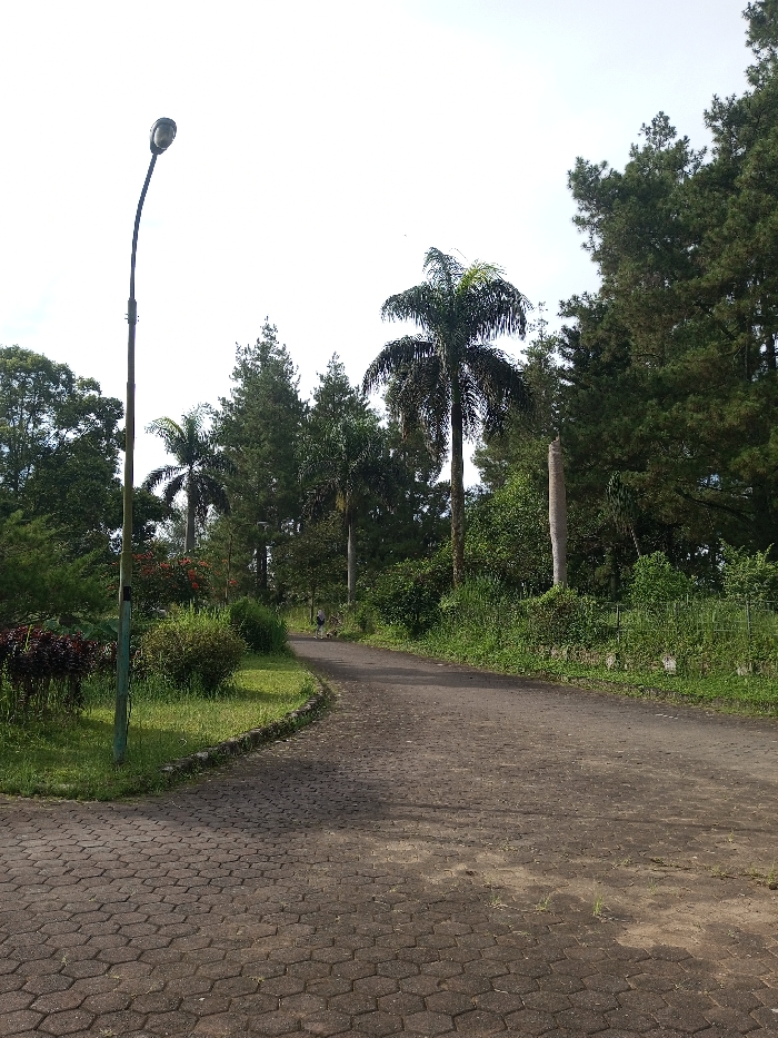 A paved pathway curves through a park landscape. Tall trees, including palms and evergreens, surround the path. A streetlamp stands to the left, near vibrant greenery. The ground is paved with hexagonal stones, showing wear and slight disrepair. A small figure is visible in the distance, walking along the path. The scene evokes a peaceful, natural setting.