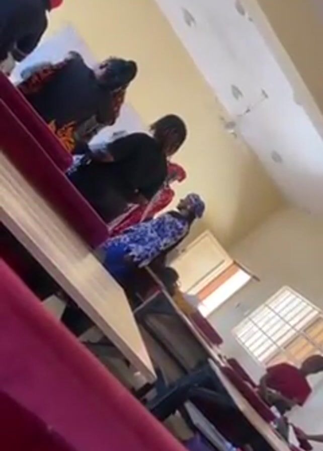 classroom setting with several people, presumably students, standing and moving around. Some are gathered near the front of the room where a whiteboard is visible, and others are standing by the desks. The desks are aligned in rows and appear to be made of light wood with red armrests. The room has a light-colored ceiling with fluorescent lighting and windows that allow natural light to enter. The camera is positioned at an angle, likely from a desk within the classroom. The people in the video appear to be casually interacting with each other.
