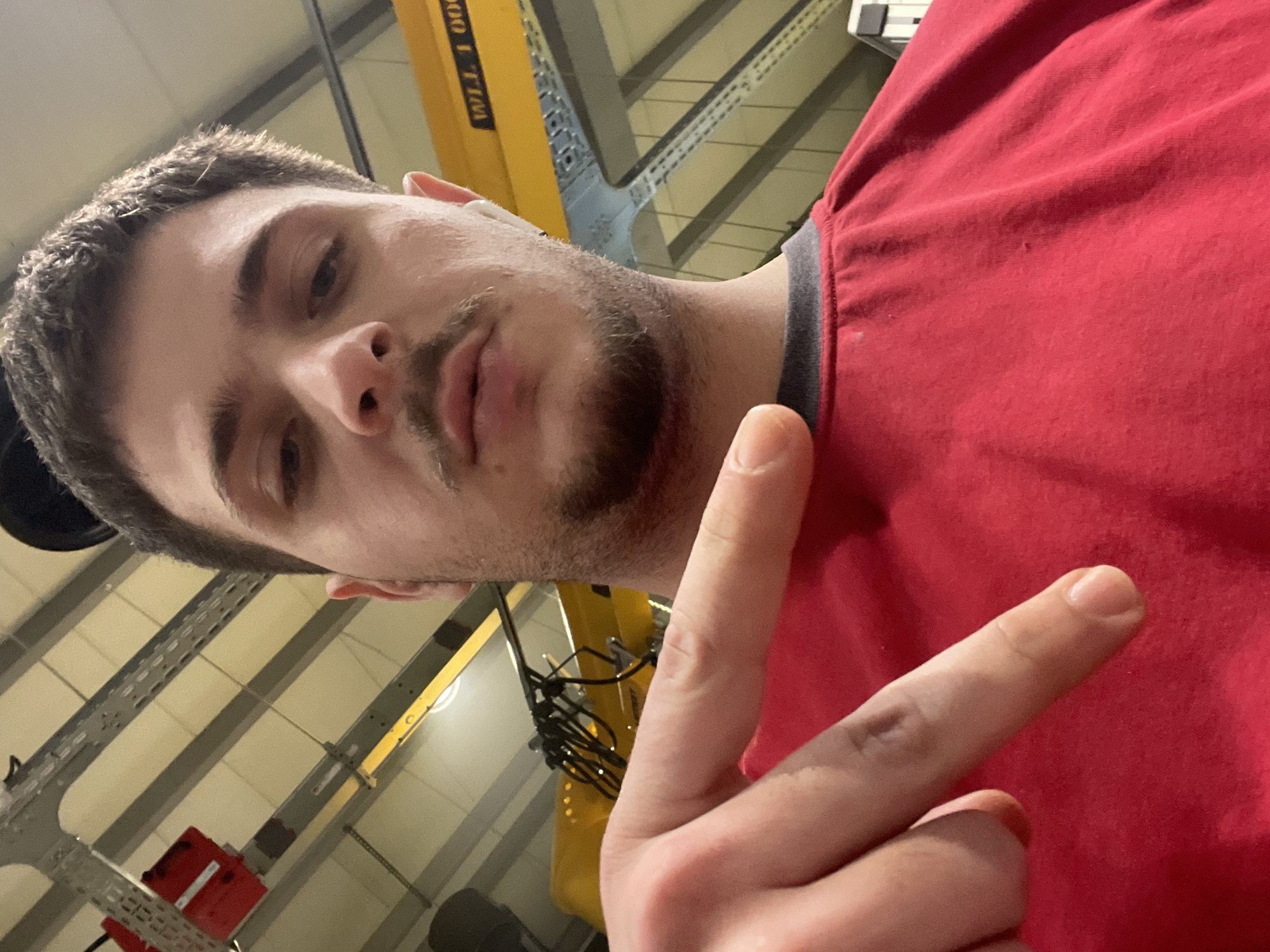A selfie-style image captures a male subject indoors within an industrial or workshop environment in the city of Lyaskovets, Bulgaria