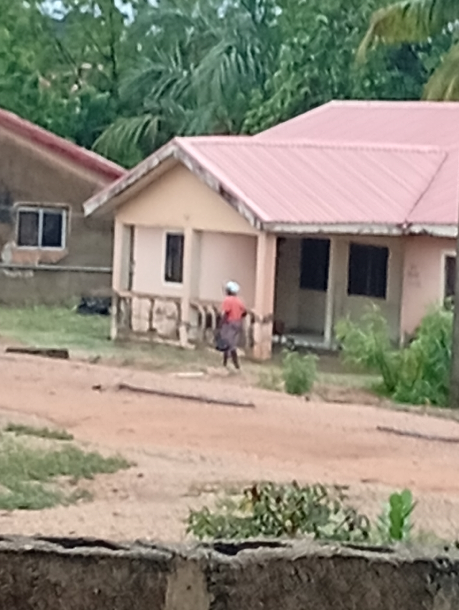 street scene in Adankolo, Nigeria. Two single-story buildings are visible in the background. The building on the right has a red roof, light-colored walls, and dark windows. A person wearing an orange top and a head covering walks in front of the building. The building on the left is grey and has a smaller window. The foreground shows a dirt road or yard with sparse vegetation and a low concrete wall. Lush green vegetation is visible in the background.