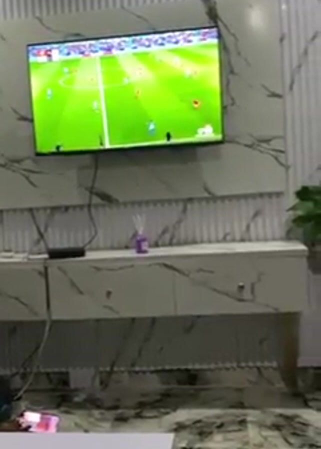 room with a television playing a soccer game. The television is mounted on a white marble-patterned wall above a matching white cabinet. Wires hang from the cabinet to the floor. In front of the cabinet is a white coffee table with various items on it, including a phone, keys, and a piece of paper. A white fan is standing near a white shelf unit. A person is partially visible lying on the floor. The room has a modern design with white, gray, and marble accents.
