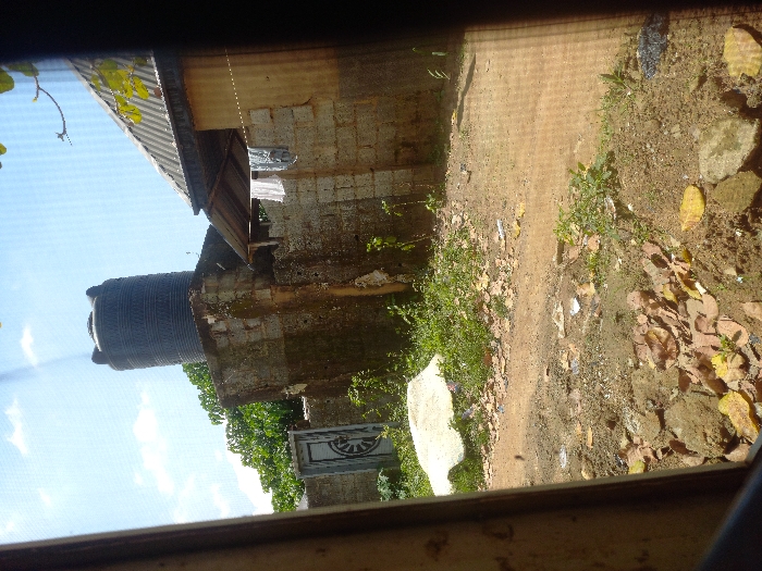 This image captures an exterior residential scene in Karmajiji, Nigeria, viewed from an interior perspective, likely through a window or doorway indicated by framing elements on the left and right. The foreground features an unpaved dirt ground, interspersed with dry brown leaves, small rocks, and sparse green weeds. In the midground, a weathered cinder block wall, exhibiting dark streaks and moss-like growth, traverses the frame. To the left, a grey metal gate with a circular design is visible against the wall. Above the wall on the left, dense green tree foliage is present. Centrally, a large, dark grey plastic water tank is positioned atop a raised, rough concrete or cinder block platform, which appears connected to the main wall structure. To the right of the water tank, a building with a corrugated metal roof is partially visible, its lower section showing cinder block construction and what appears to be corrugated siding. Light-colored laundry items are suspended on a line or draped near the building's wall. The background consists of a clear blue sky with scattered white clouds. No individuals are present in the scene.