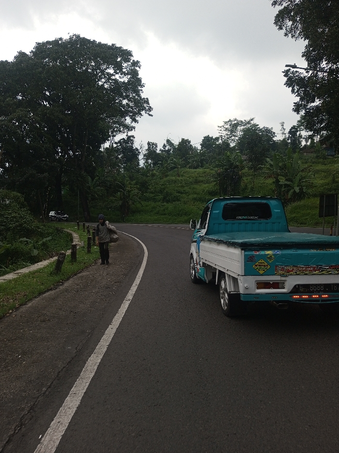 The scene depicts a curved asphalt road on an overcast day in the city of Sandamal Eliya, Sri Lanka. In the right foreground, a light blue and white pickup truck, bearing license plate '8688 TB', travels away from the viewer. The truck's bed is covered with a blue tarp, and its rear features multiple stickers and an aftermarket exhaust pipe. To the left, an adult male walks on a dirt and gravel shoulder alongside the road. He is dressed in a light-colored long-sleeved top and dark trousers, carrying a large, light-colored, irregularly shaped bundle over his left shoulder. The shoulder is delineated by a low concrete curb and several short wooden posts. The environment is heavily vegetated with dense green foliage, including tall trees dominating the left side and a lush, sloped hillside on the right. Two additional vehicles are partially visible parked beneath trees in the far left background. The sky is uniformly grey with dense cloud cover.