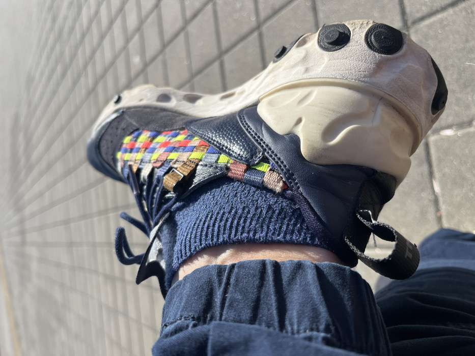 The image displays a close-up, downward-angled view of a person's left foot, wearing a shoe and pants, set against a paved outdoor surface in Kostinbrod, Bulgaria. The subject is a foot clad in a navy blue athletic shoe featuring a prominent multi-colored woven section on the upper (red, yellow, blue, green, pink, brown threads) and a thick, textured, off-white/cream sole with black traction nubs. Navy blue laces are tied. The person wears navy blue pants, likely joggers, with visible fabric folds and a dark blue ribbed sock. The ground is paved with light-colored rectangular tiles arranged in a grid pattern. Strong sunlight is present, casting distinct shadows and illuminating the scene. The shoe appears moderately worn, particularly the sole.