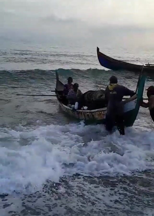 In a medium shot, a small, dark-colored boat with a green trim sits in the surf near a beach. Three people are in the boat, and one person, dressed in dark clothes and a face mask, stands in the water, holding the side of the boat. A second boat, smaller and similarly colored, sits further out in the water. The sky is overcast, and the beach is dark sand. The surf is foamy and white.