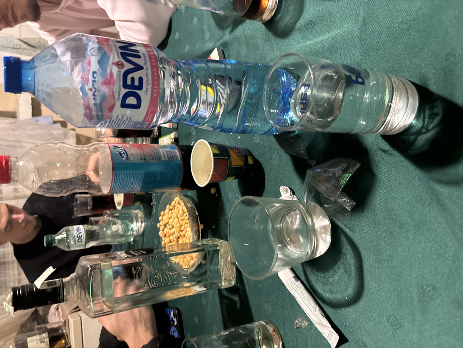 The image provides an elevated view of a table in Harmanli, Bulgaria, covered with a dark green tablecloth, indicative of an indoor gathering. Three individuals are partially visible: one person in the upper left wearing a dark top, with a hand resting near a mobile phone; another in the upper center with short dark hair, head slightly bowed; and a third on the right wearing a light pink hooded sweatshirt. The table is laden with various bottles and containers. A prominent clear glass bottle labeled "SAVOY VODKA" has a white straw protruding from its neck. Adjacent to it is a clear plastic bottle with a red cap, partially filled with a dark liquid, identified as "NESTEA Forest Fruit." A large, ribbed blue-capped plastic bottle of "DEVIN" mineral water, approximately two-thirds full, stands on the right. Another smaller, nearly empty clear plastic bottle, also labeled "DEVIN," is visible in the background. A clear glass bowl contains a quantity of light brown, rounded snacks, resembling roasted chickpeas. Several drinking glasses and cups are present: two empty clear rocks glasses, one clear shot glass containing a clear liquid, and a patterned disposable paper cup with a light brown residue inside. A glass containing a dark liquid is partially visible on the far right, and another empty clear glass is on the far left. Other items on the table include a crumpled clear plastic wrapper near an empty glass, a sealed white packet with blue text, two small cigarette lighters (one yellow, one blue) behind the "NESTEA" bottle, and several playing cards or similar small items visible beneath the large "DEVIN" bottle. The background features a light-colored, possibly textured wall. Overhead lighting casts distinct shadows on the green tablecloth.