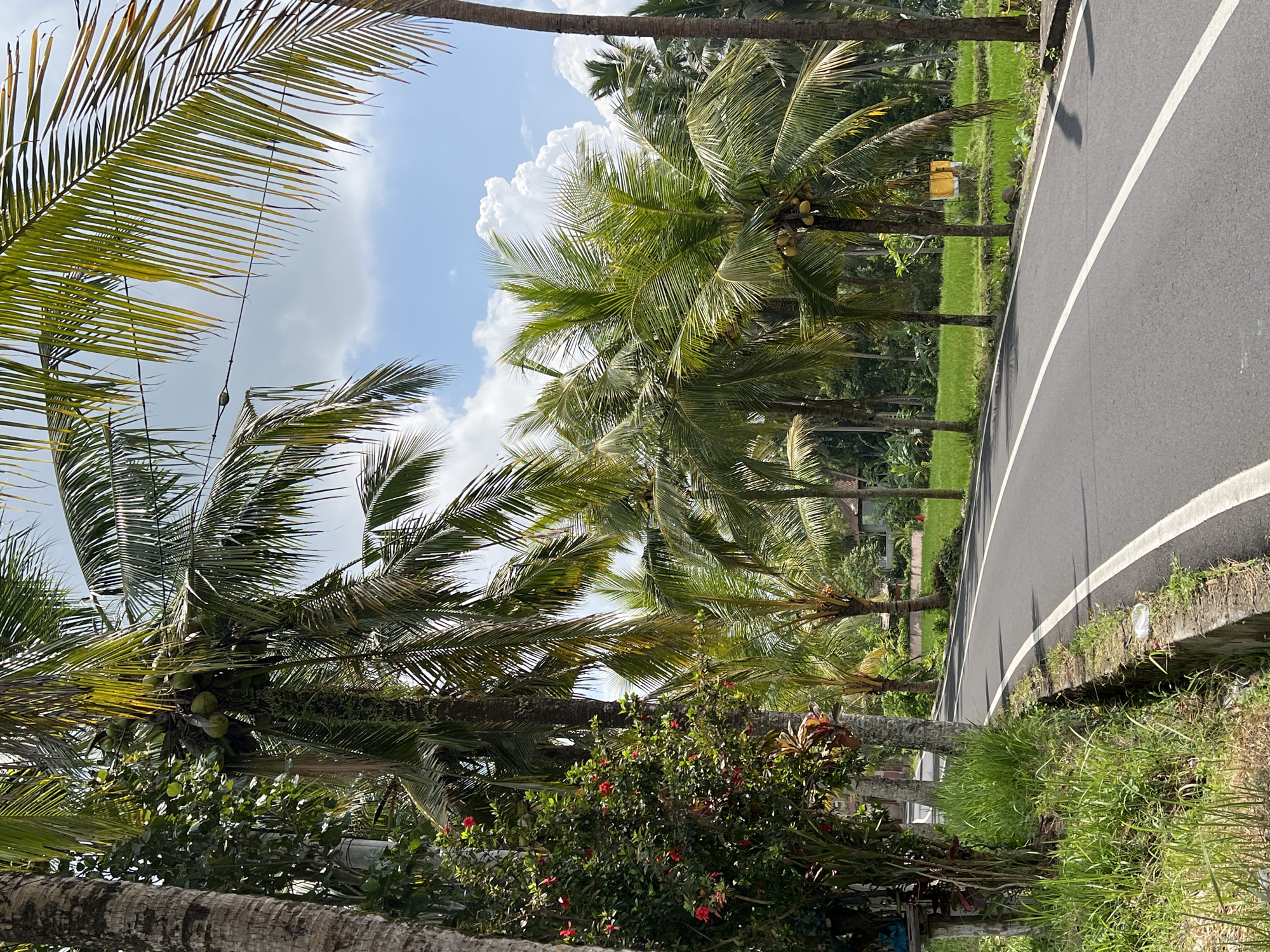 The image captures a road in Ubud, Indonesia, lined with palm trees. The road surface is dark asphalt with a white line marking the edge. Beyond the road is a lush green field. Palm trees are prominent on both sides of the road, their fronds reaching towards a sky dotted with fluffy white clouds. In the foreground, a bush with small red flowers adds a touch of color to the scene.