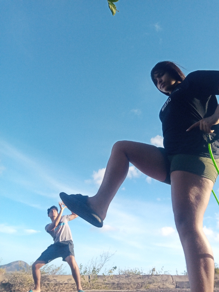 This low-angle photograph, taken in Altagracia, Venezuela, depicts two individuals outdoors under a clear blue sky with sparse clouds. In the immediate foreground on the right, a person with dark, shoulder-length hair, wearing a black t-shirt with "DENIM" printed in white and olive green shorts, stands with their right leg raised, bent at the knee, and a black slide sandal on their foot. A bright green hose or rope is visible, running down from their right hand/hip area. Their left hand is placed on their hip. In the mid-ground to the left, a second individual, wearing a light grey t-shirt and dark shorts, is positioned with bent knees and both arms raised in a defensive or playful posture, appearing to react to the foreground individual's raised foot. The background features a distant, dark mountainous or hilly landscape on the far left horizon, with sparse, dry vegetation and a light-colored concrete or stone barrier running horizontally across the lower frame. A single green leaf is visible at the top center of the image.