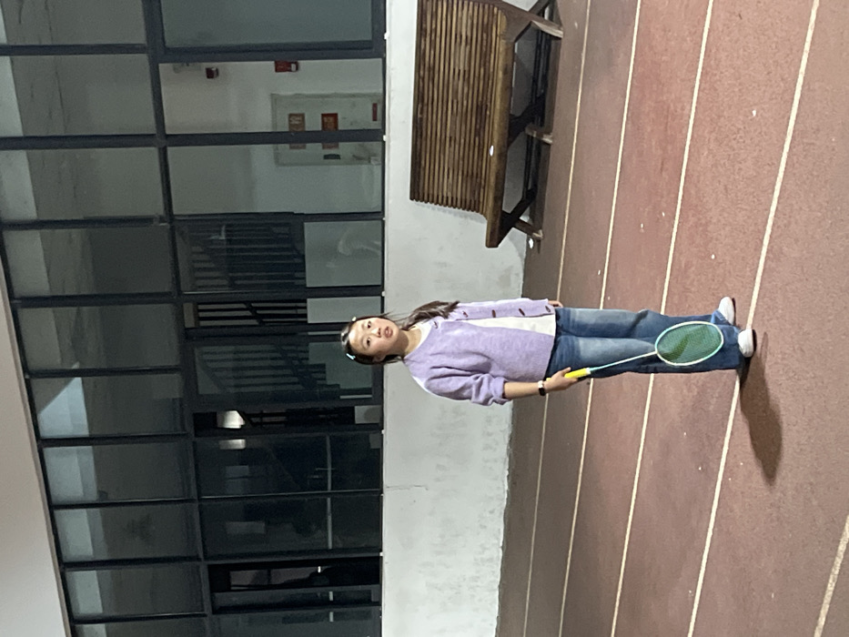 - "A young female stands on a reddish-brown track marked with white lines, holding a yellow, blue, and green badminton racket in her left hand, which points towards the ground" by FM-Taoqm1, licensed under CC BY 4.0