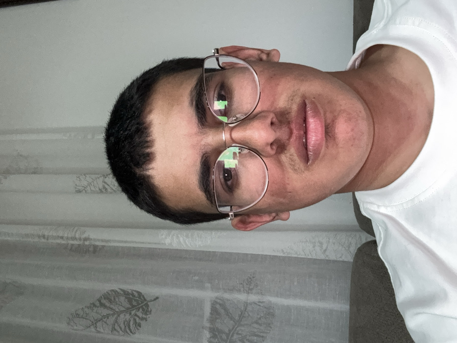 The image displays a single individual, identified as male, located indoors in Kanchevo, Bulgaria. The subject presents with short, dark hair and wears light-colored, possibly gold-toned, framed eyeglasses that exhibit green light reflections. Notable facial features include light stubble on the upper lip and chin, along with areas of redness or blotchiness on the cheeks and forehead. The individual is clad in a white crew-neck t-shirt and maintains a direct, neutral gaze towards the camera. The background consists of a sheer, light-colored curtain adorned with dark leaf patterns on the left side, and a plain, light-colored wall on the right. A portion of a light brown or grey upholstered object is visible at the bottom left of the frame.