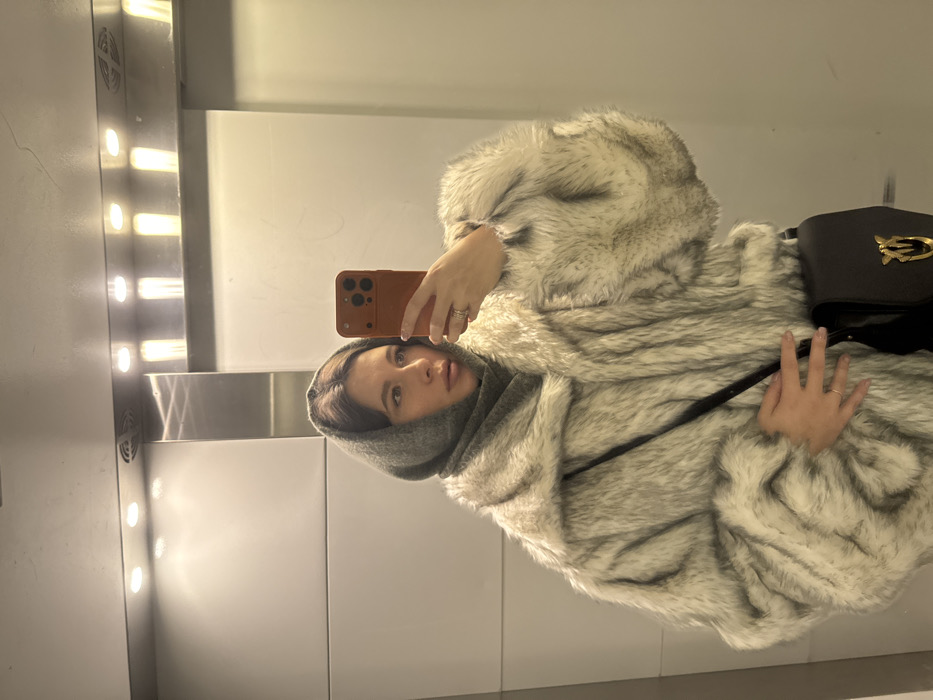 A person wearing a gray hooded scarf and a large, light gray and white faux fur coat takes a selfie in a mirrored elevator. Their phone, in a brown case, is visible in their hand. A black handbag hangs on their shoulder. Elevator lighting is visible to the left. The reflection reveals a brightly lit, modern interior.