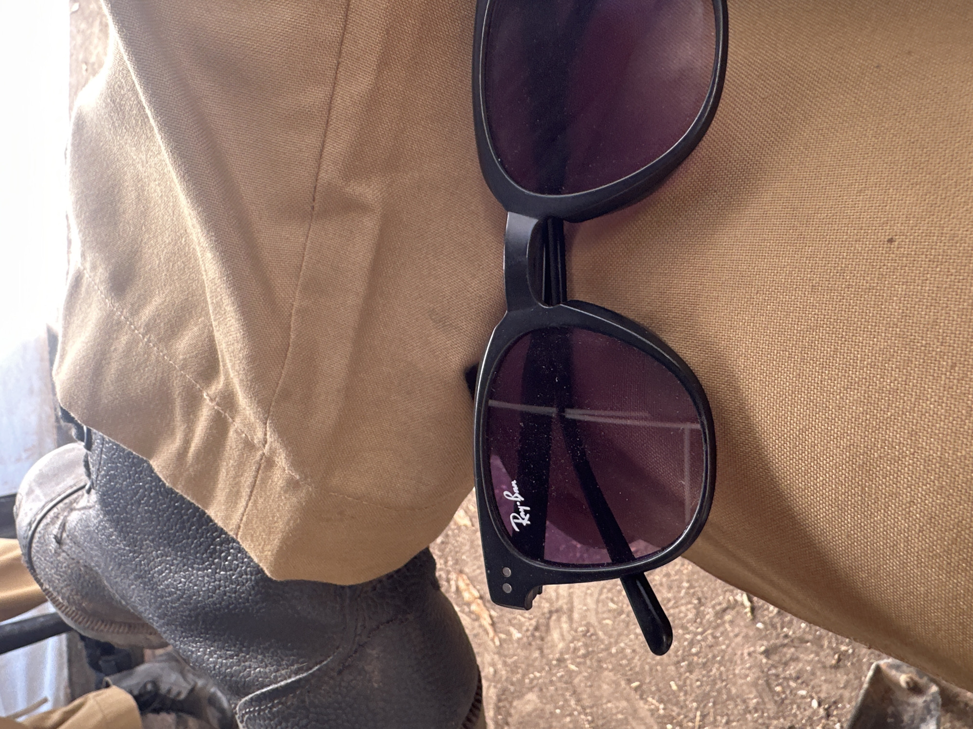 A pair of black Ray-Ban sunglasses rests against tan pants, possibly khaki, with the edge of a dark leather boot visible at the lower left