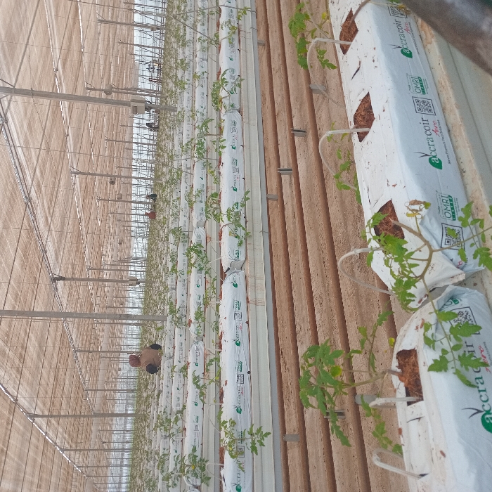 The image displays an expansive indoor agricultural greenhouse facility, located in the city of Unknown, Unknown. Numerous rows of young plants, characterized by green leaves consistent with tomato seedlings, are cultivated within white rectangular grow bags. These bags are prominently labeled "accracoir" and feature additional branding, including QR codes and "OMRT". The bags are filled with a brown, fibrous substrate and are positioned on elevated white troughs supported by a metal framework. White flexible tubes extend from the top of the grow bags, indicating a drip irrigation system. The greenhouse structure features a vast ceiling covered with a translucent, light-filtering fabric or mesh, supported by a dense array of slender metal poles extending vertically from the ground. The ground level between the plant rows consists of bare earth or soil, with parallel brown pipes or conduits visible. In the mid-ground, slightly to the left of the center, one individual is observed from behind, wearing a light brown top and a head covering. This person is bent over, actively engaged in tending to the plants. Further in the background, several additional blurred figures are discernible, also appearing to be performing agricultural tasks within the facility. The environment is uniformly lit, suggesting ambient daylight filtering through the roof structure, and exhibits an organized, systematic arrangement typical of large-scale controlled agriculture.