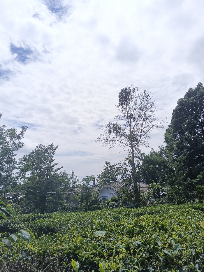A vibrant green tea field stretches across the foreground, leading to a white building partially hidden by lush trees and foliage. Overhead, a cloudy sky fills the majority of the frame, hinting at a possibly overcast day. A tall, bare tree stands out amidst the other green trees and plants, its branches reaching towards the sky. The scenery evokes a serene and natural atmosphere.