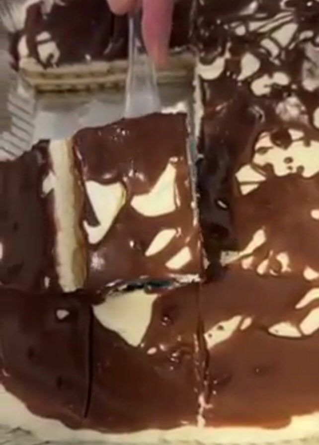 A close-up shot shows a hand using a clear plastic spatula to lift a piece of a layered dessert from a foil baking pan. The dessert consists of a layer of cookies on the bottom, followed by a layer of white cream, and topped with a drizzled chocolate glaze. The pan contains multiple pieces, cut into squares. The hand removes one of the pieces, showing the layers clearly. The background is slightly out of focus, but appears to be a kitchen countertop.