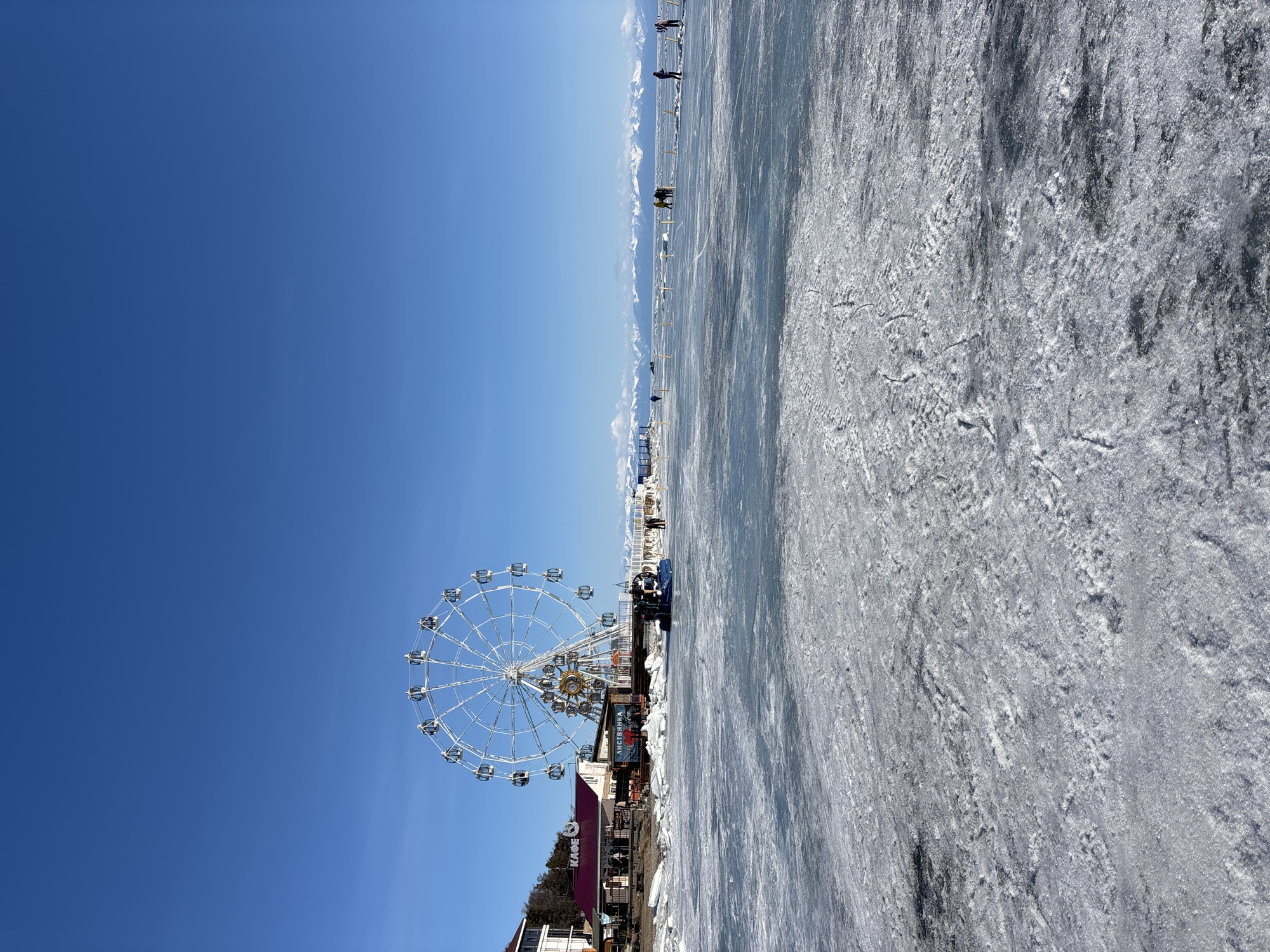 This image depicts a wide-angle view of a frozen body of water, identified as Lake Baikal, in Listvyanka, Russia, under a clear, intense blue sky. The foreground and midground are dominated by an expansive frozen surface, exhibiting varying textures of compacted snow, rough ice, and smoother, translucent ice patches. Numerous tracks from foot traffic and possibly vehicles or skates are visible across the ice. On the left side of the frame, near the shoreline, a large white Ferris wheel with multiple enclosed cabins serves as a prominent focal point. To the immediate left of the Ferris wheel, several buildings are visible; one with a red roof clearly displays the Cyrillic word "КАФЕ" (CAFE), and another structure exhibits a sign bearing "ЛИСТВЯНКА" (LISTVYANKA). Positioned on the ice slightly to the right of the Ferris wheel is a blue and black hovercraft or airboat, appearing stationary. Multiple individuals, dressed in winter attire, are dispersed across the frozen lake. A small cluster of people stands near the hovercraft. Further out on the ice, a series of upright posts connected by ropes delineates an area, with several small groups of individuals standing or walking adjacent to these markers. A single person is observed walking in the left-midground, beyond the delineated area. In the far background, a distinct range of snow-capped mountains extends horizontally across the horizon. The overall scene suggests a sunny, cold day at a recreational location on a frozen lake.