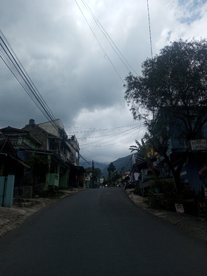 The scene depicts a street in the city of Kalchini, India, under a heavily overcast sky with dark grey clouds. A paved asphalt road, dark in tone, leads uphill and curves gently to the right, receding into the distance where a mountainous landscape is visible. Overhead, a dense network of black electrical wires and communication cables spans the street. On the left side of the road, a row of multi-story buildings stands close together. These structures exhibit varying architectural styles, with some featuring green lower sections and others appearing to have brick or light-colored plaster facades. Balconies and intricate utility wiring are visible along these buildings. The right side of the road features similar residential or commercial structures, partially obscured by a large, leafy green tree positioned prominently in the mid-ground. A light blue building is visible behind this tree. Attached to the tree or an adjacent structure is a white sign with dark text, clearly legible as "PONDOK ASRI". Below this, another smaller, partially obscured sign is present. Further down the road on the right, a light-colored pickup truck is parked, and laundry hangs on a line near a building. No distinct individuals or specific activities are clearly discernible within the frame, though distant figures may be present further up the road.