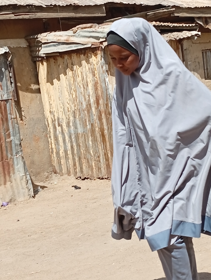 A single female individual is depicted in Gwagwarwa, Nigeria, standing on light brown sandy ground. She is positioned towards the right of the frame, partially obscured, with her head tilted downwards and to her left. She wears a light grey hijab covering her head and chest, with a visible black undercap. Her attire includes a matching light grey long-sleeved garment with a light blue border at the lower hem, covering what appears to be light grey trousers. The background features structures composed primarily of heavily rusted corrugated metal sheets exhibiting brown, orange, and grey discoloration, interspersed with sections of light-colored, possibly concrete or mud, walls. A weathered corrugated metal roofline is visible above these structures. Small, dark debris is scattered across the foreground ground. The scene is illuminated by strong daylight, casting visible shadows. No other individuals or significant interactions are evident.