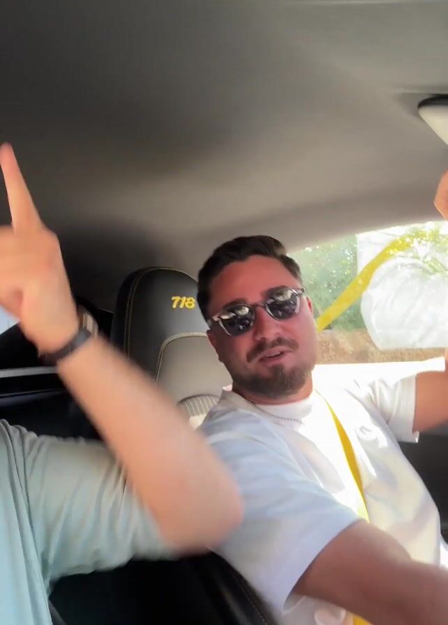 Two men are inside a car, listening to music. The driver is wearing sunglasses and a white t-shirt, with a yellow seatbelt. The passenger, wearing a light blue t-shirt and a bracelet, is dancing along to the music. The headrest of the seat reads "718." The video is shaky.