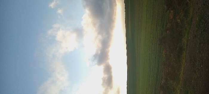 The image displays a rural landscape in Ait Naamane, Morocco, under a partially cloudy sky. The upper two-thirds of the frame feature a light blue sky with scattered white and grey cloud formations. A strong, obscured light source, consistent with the sun low on the horizon, emanates a bright white light horizontally across the middle of the frame, illuminating the undersides of a large, dense cloud bank. A dark, indistinct silhouette line is visible at the horizon, beneath the brightest light, likely representing distant natural or man-made structures. The lower third of the image is dominated by an expansive, uniformly green field, indicative of agricultural land or pasture. The immediate foreground presents a narrow strip of darker, uneven ground, possibly a dirt path or verge, containing minor irregularities and dark patches of sparse vegetation. No individuals, animals, specific objects beyond the landscape, actions, or interactions are visible within the scene. The lighting conditions suggest either dawn or dusk.