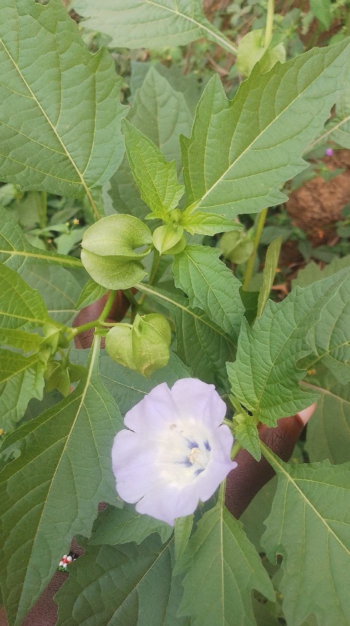 The image displays a close-up view of a plant in the Nkaimurunya ward, Kenya. The scene is dominated by green foliage, consisting of several large, green leaves exhibiting distinct venation and partially serrated margins. Multiple green, inflated, papery calyces, characteristic of a *Physalis* species, are present on the plant's stems. One prominent, fully open flower is visible in the lower center, featuring pale purple to white petals, a central yellow-white pistil/stamen structure, and faint blue internal markings. A dark-skinned hand is partially visible on the right side of the frame, appearing to grasp or support a stem adjacent to the flower and calyces. A small, multi-colored beaded object, displaying red, white, and black elements, is partially obscured by a leaf on the lower left. The background consists of blurred green vegetation and hints of reddish-brown soil, indicating an outdoor setting.