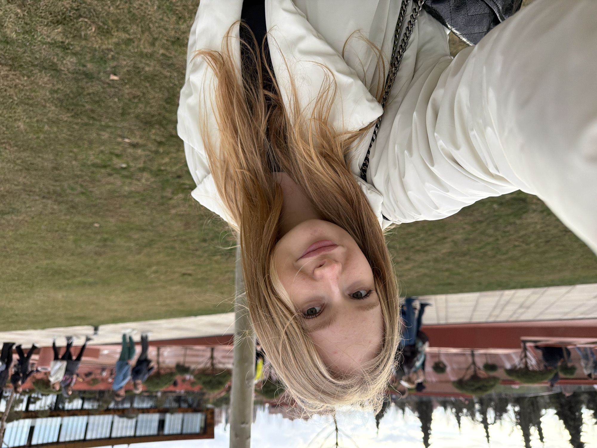 - "A young, blonde-haired woman takes a selfie, wearing a white jacket with a chain bag" by FM-t12ef2, licensed under CC BY 4.0