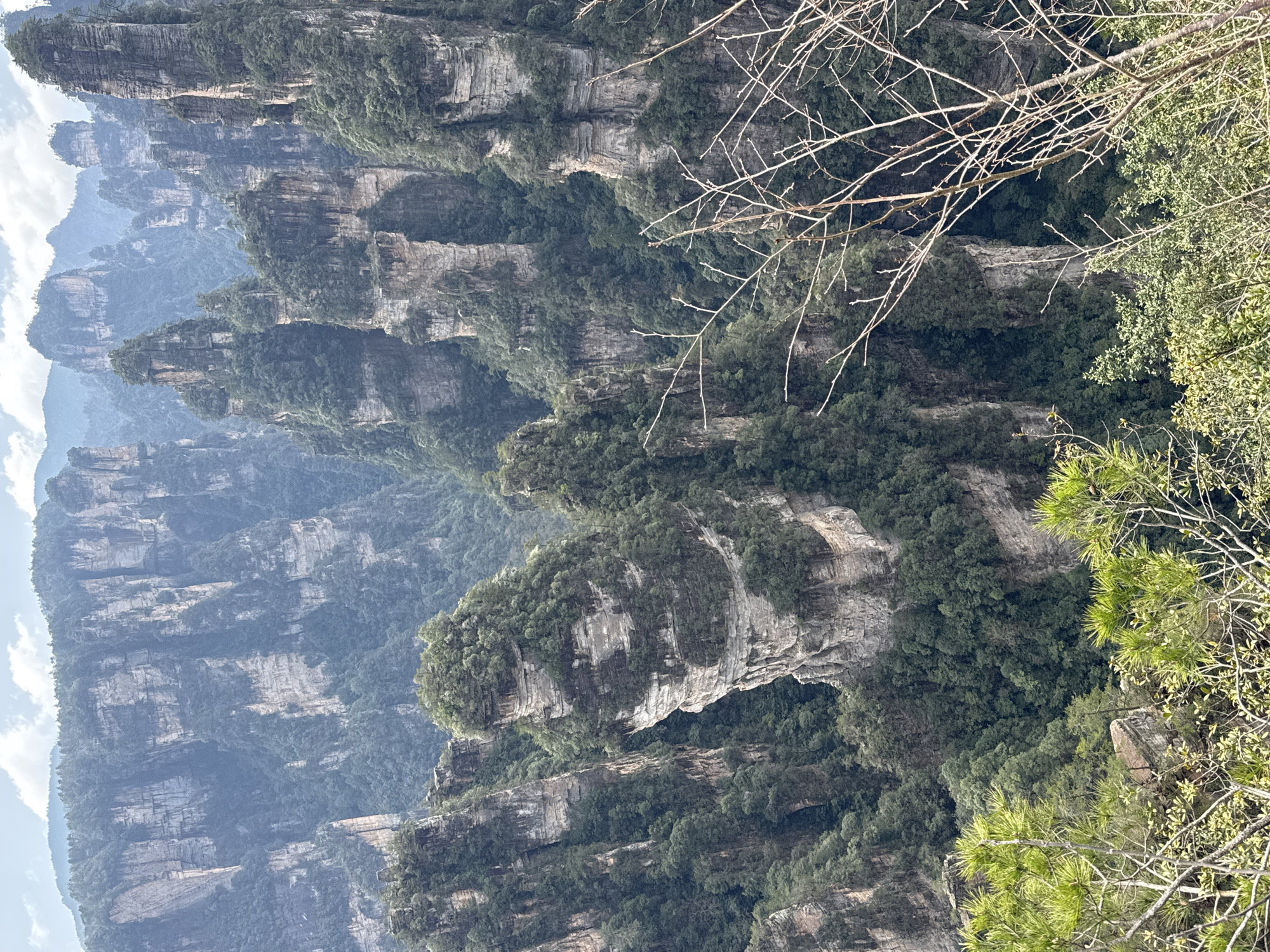 This image depicts a vast, verdant mountainous landscape characterized by numerous towering sandstone pillars, situated in the city of Luoguta, China. The scene is dominated by multiple vertical rock formations, light gray to tan in coloration with discernible horizontal striations, rising sharply from the terrain. These geological structures are extensively covered with dense, dark green foliage on their summits and along their upper and mid-sections, with thick forests filling the deep valleys and lower slopes between them. In the foreground, on the right side, out-of-focus bare, light-colored tree branches with fine twigs are prominent. On the left, vibrant green, pine-like foliage from another tree or shrub is visible. Distant mountains and pillars recede into a pale blue-gray atmospheric haze under a mostly cloudy, light-colored sky, conveying significant depth. A small, faint white structure, consistent with a pagoda or gazebo, is visible on a distant ridge within the upper left quadrant. No human figures or active interactions are present; the scene presents a static, natural environment.