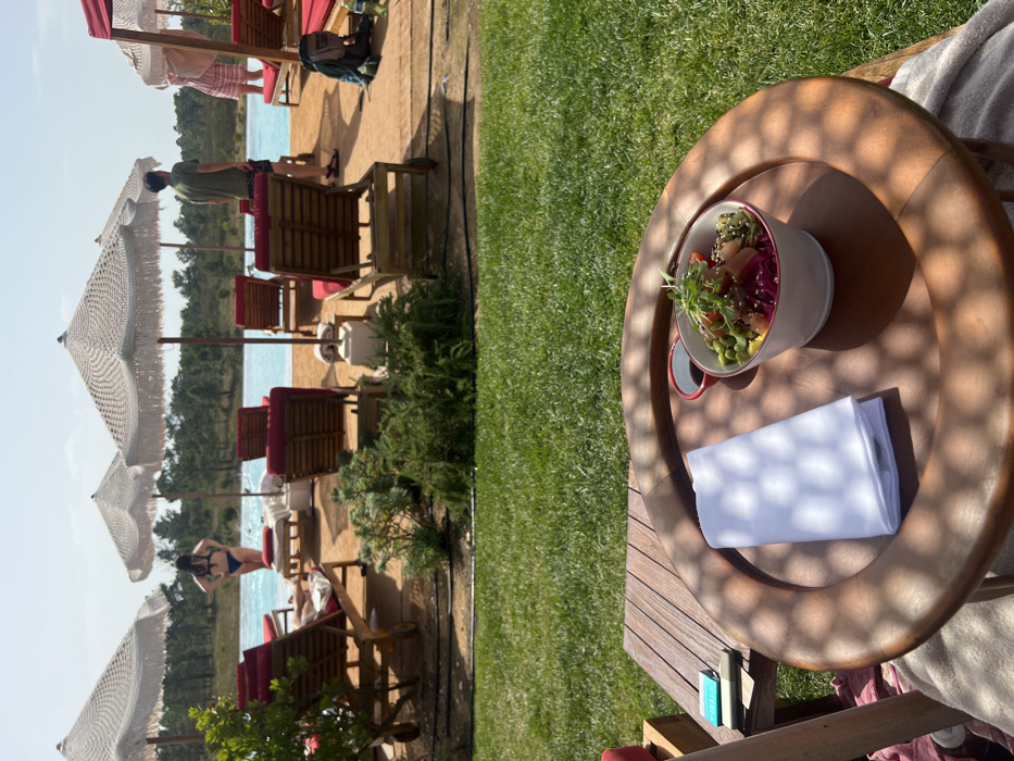The image depicts an outdoor leisure area at a resort in Aljezur, Portugal, under bright daylight. In the foreground, a round, low-lying wooden table rests on a manicured green lawn, displaying a white folded napkin and a white bowl with a red rim filled with a colorful meal, accompanied by a small dish of dark liquid. A small blue packaged item is also present on an adjacent wooden surface. Mesh-patterned shadows from an overhead structure are cast across the table and lawn. Beyond the lawn, a narrow strip of green foliage separates the foreground from a light-colored wooden deck. The deck is furnished with multiple wooden lounge chairs featuring red cushions, positioned beneath several white, fringed patio umbrellas. An expansive infinity pool with clear turquoise water occupies the mid-ground. People are visible on the deck near the pool: one individual in a dark blue bikini stands at the pool's edge, facing away, towards the left. Another individual in a green t-shirt and dark shorts stands further to the right, also facing away from the viewer. A dense forest of evergreen trees forms the distant background, bordering the horizon under a clear, light-blue sky.