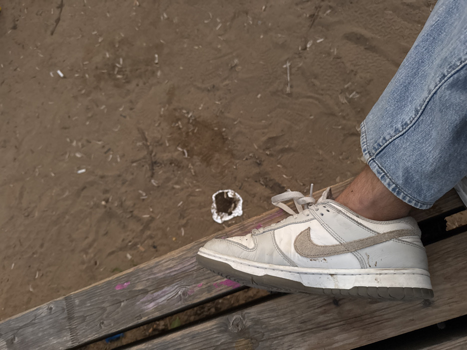 The image displays a forensic view of a human leg and foot positioned on a weathered wooden bench. The subject is wearing light blue denim jeans, cuffed above the ankle, and a worn light grey or off-white Nike Dunk Low sneaker with a beige suede Nike swoosh. The sneaker exhibits visible dirt, scuff marks, and creasing across its surface and sole. The wooden bench, constructed from multiple planks, shows signs of age and contains faint pink graffiti or paint residue. The ground visible below and to the right of the bench is a reddish-brown, sandy earth surface, littered with numerous small white objects resembling discarded cigarette butts, along with other miscellaneous organic debris. A crumpled piece of aluminum foil, appearing roughly circular, is present on the ground, containing dark, charred residue within its center. No specific landmarks or distinguishing features are present to definitively pinpoint a precise location within the city of Tel Aviv, Israel; however, the scene depicts an outdoor, unpaved environment. The overall lighting is diffuse, suggesting ambient conditions.