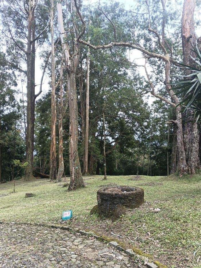 A glade is surrounded by tall trees, some with peeling bark. A circular, moss-covered stone structure sits in the foreground, with a small blue sign next to it. A cobblestone path leads to the glade. The grass is green and uneven. Other trees fill the background.