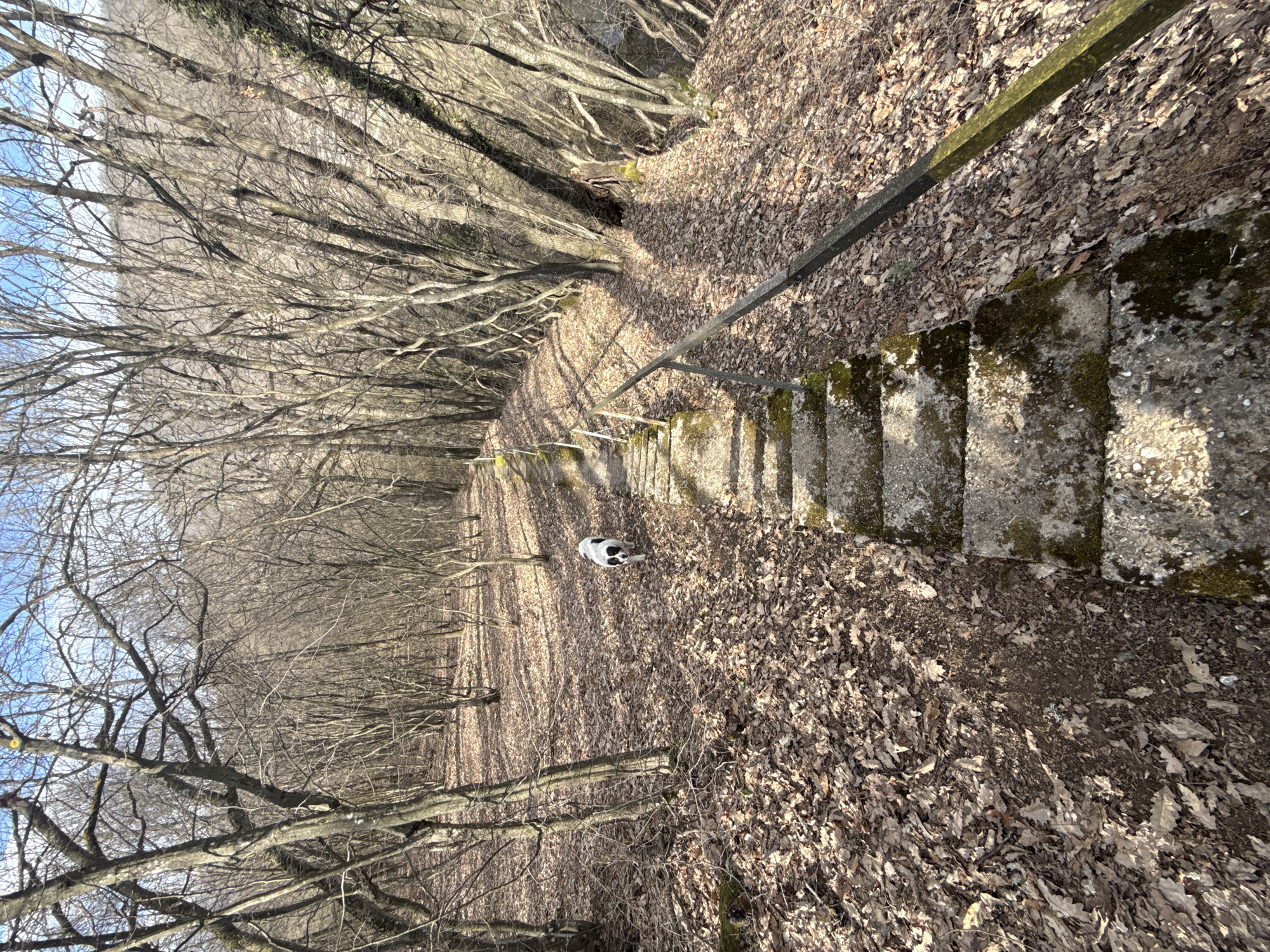 The scene captures a descending concrete staircase and an adjacent earthen path within a deciduous forest in Lovech, Bulgaria. A single black and white dog, resembling a Border Collie, is observed walking downhill on the left side of the staircase, with its head oriented towards the ground. The concrete steps are aged and weathered, exhibiting patches of dark green moss and accumulated organic material. A dark-colored metal handrail extends along the right side of the staircase. The forest floor is extensively covered with dry, brown fallen leaves. Numerous leafless deciduous trees with bare branches line the path, indicative of late autumn or early spring conditions. Direct sunlight, originating from the right, casts distinct shadows across the path and steps. A partial view of a clear blue sky with sparse white clouds is visible through the tree canopy. A distant, indistinct landscape of hills or a valley is discernible through the bare branches in the background.