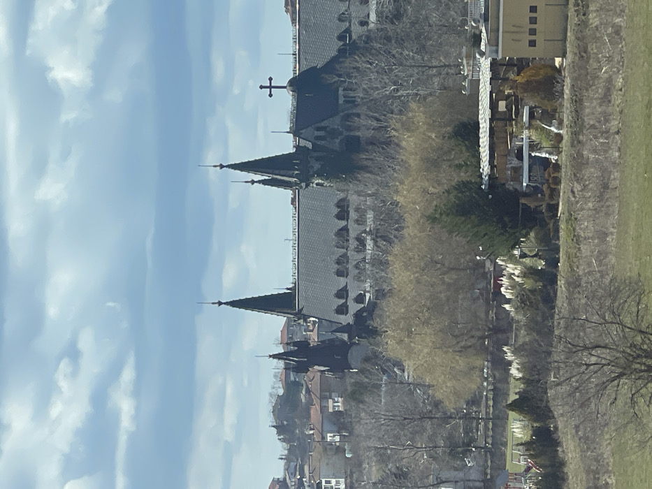 The image presents an elevated, long-distance view of the "Castle in Love with the Wind" structure located in Ravadinovo, Bulgaria. The central subject is a large, dark, multi-turreted building, resembling a Gothic castle, positioned in the mid-background. It features several pointed spires, a dark roof with numerous visible dormer windows, and a cupola topped with a Christian cross on the far right. Sections of the building's facade appear dark, possibly from a dark material or dense foliage. Behind the castle, on a distant hillside, residential buildings with reddish-brown roofs are visible. The midground consists of a landscaped area containing bare deciduous trees, scattered evergreen trees, and clusters of white, feathery ornamental grasses. To the right, a portion of a light-colored building with an adjacent outdoor decorative area, featuring white statues and a covered pergola-like structure, is visible. A children's playground with red and yellow equipment is faintly discernible on the left midground. The immediate foreground is an expanse of dry, grassy terrain with sparse, bare trees. The sky is partially cloudy, displaying a mix of blue and grey cloud formations. No individuals are present.