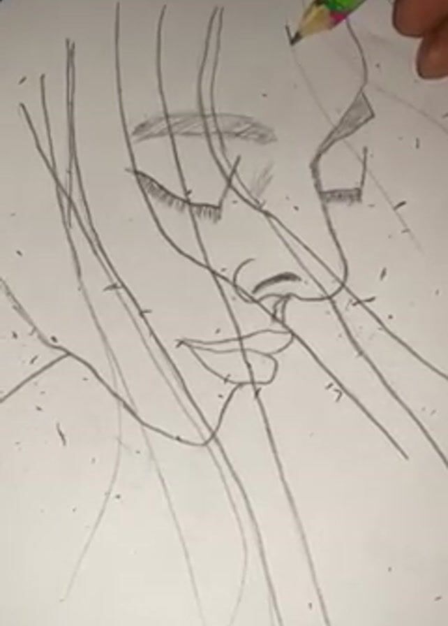 A hand is drawing on a piece of white paper with a pencil. The drawing depicts a woman's face in profile, with her eyes closed and hair obscuring part of her face. The pencil is pink and green. Eraser shavings are visible on the paper.