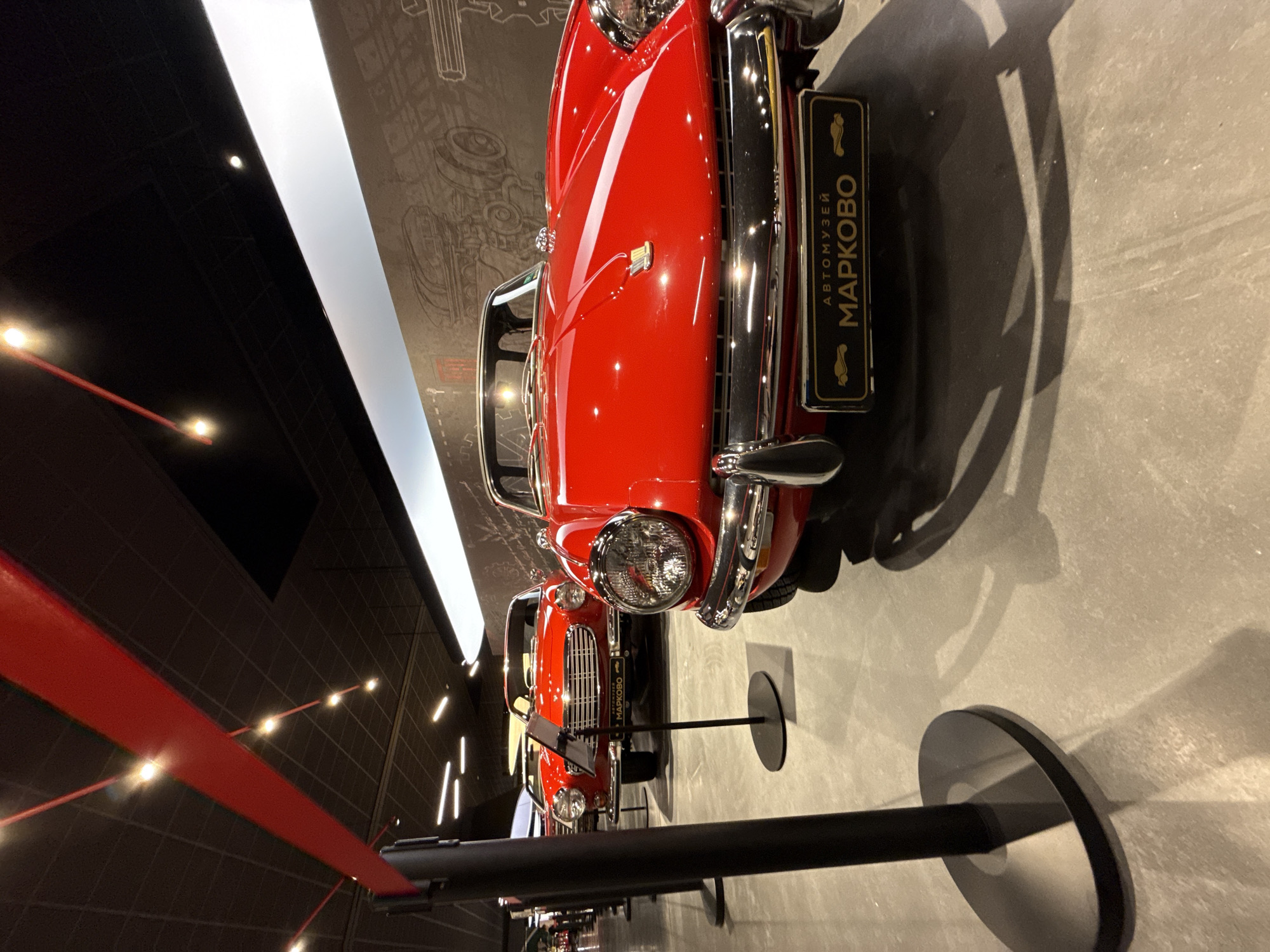row of red vintage cars in a museum setting. A black stanchion with a red barrier stands in the foreground, partially obscuring the view. The cars are lined up, and a sign on one of them reads "Автомузей Марково," which translates to "Automuseum Markovo." This suggests the location is in Markovo, Bulgaria. The cars are displayed under bright lighting against a background that includes architectural drawings or sketches of vehicles. The floor is gray. The scene is static; there are no people visible, and no actions are occurring. The cars are the primary objects of interest, being displayed within a museum environment.