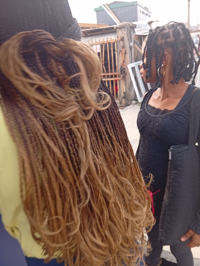 Two women are seen outdoors. One is facing away, wearing a dark beanie and a yellow shirt. Her hair is styled in long, brown braids with blonde tips. The other woman faces right, wearing a black top, gold hoop earrings, and carrying a black tote bag. Her hair is styled in twisted braids. A metal gate, a wooden post, and a white-framed window are visible in the background. The surroundings suggest an urban or semi-urban environment.