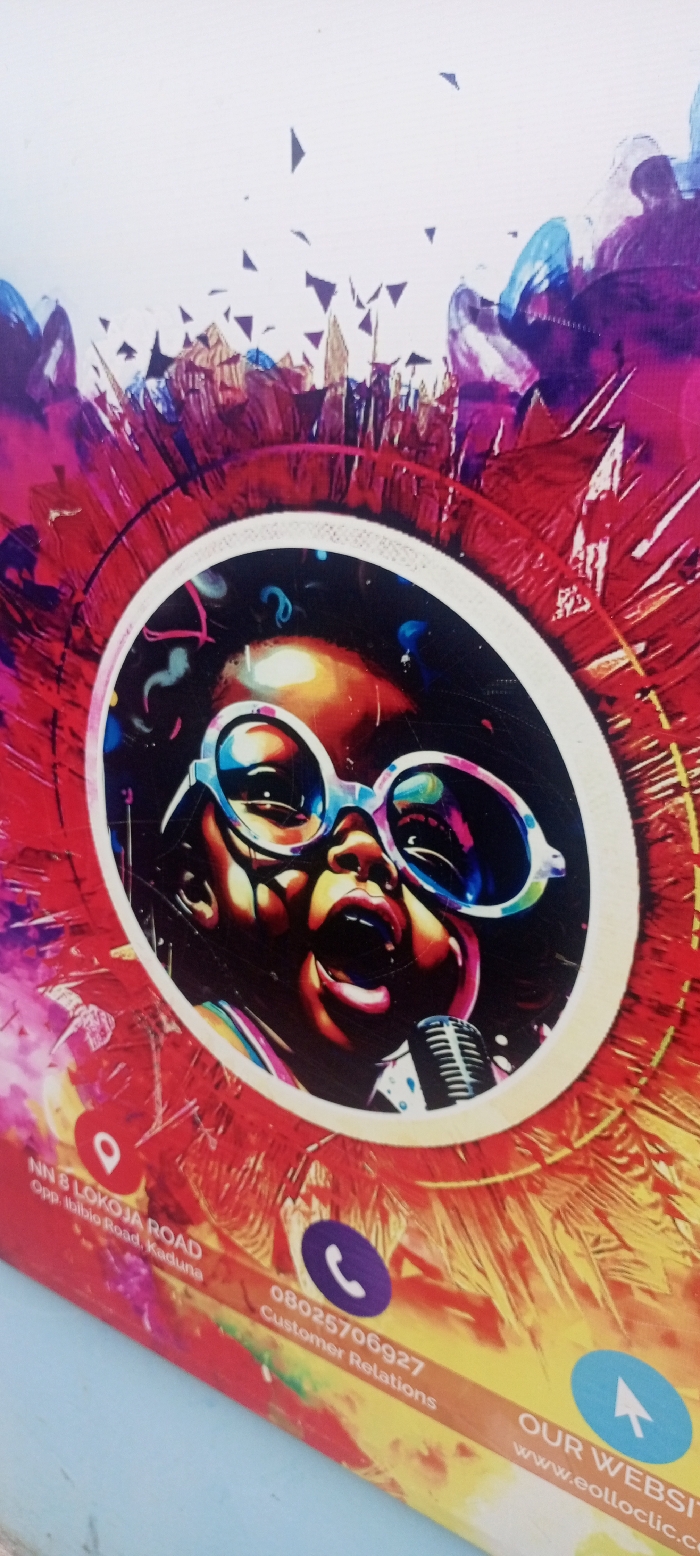 This image displays a vibrant, colorful graphic printed on a physical sign, located in Kaduna, within the Dadi Riba area, Nigeria