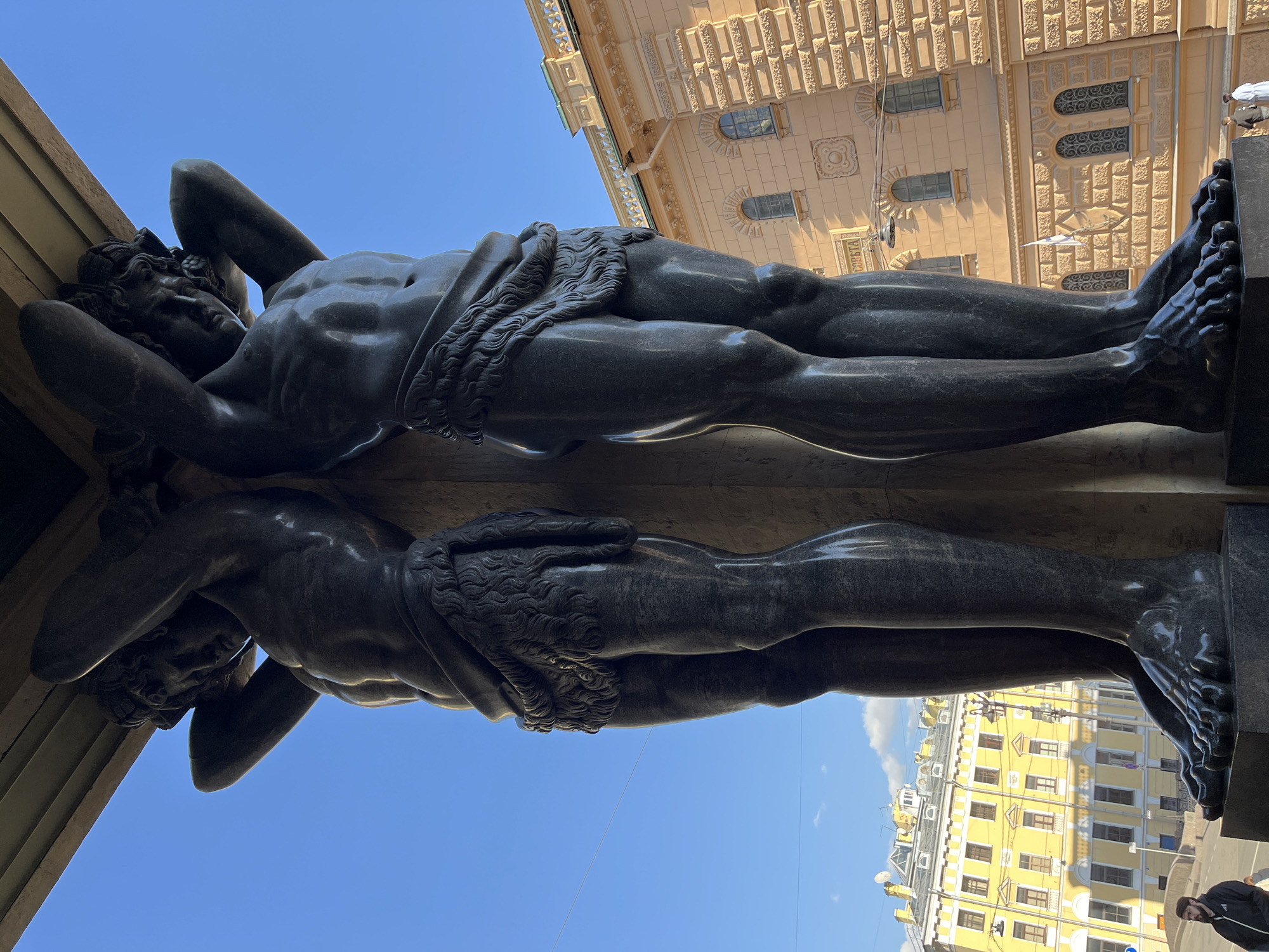 The image displays a close-up, upward-angled view of two dark grey, polished granite statues of Atlantes, forming part of the Portico of the New Hermitage on Palace Embankment in Saint Petersburg, Russia. The muscular, semi-nude male figures are depicted from mid-torso downwards, each wearing a textured loincloth. They stand with their backs against a central column, arms raised overhead, supporting a massive entablature or roof section, partially visible at the top of the frame. Their heads are bowed under the apparent burden. The background consists of a clear, vibrant blue sky. To the right, a multi-story building with a light peach-colored, rusticated facade is visible, featuring arched windows with dark grilles and decorative cornices. To the left and further back, a bright yellow building with white trim and numerous windows is present. A bearded man in a dark jacket is partially visible on a pavement in the lower left foreground. Two distant figures are discernible near the base of the peach-colored building on the right. Overhead wires are visible against the sky.