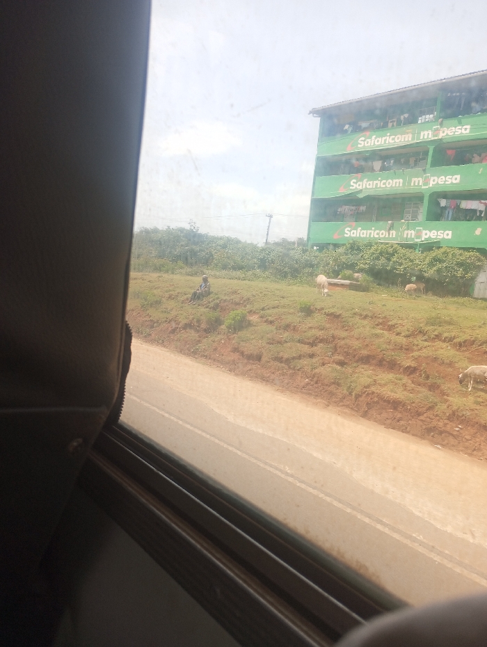The image depicts an outdoor scene in Limuru, Kenya, viewed through a dusty vehicle window. The immediate foreground shows the dark grey interior frame of a vehicle window on the left and bottom, obscuring part of the view. A narrow, unpaved or dirt road runs horizontally across the mid-bottom of the frame. Above the road, a grassy embankment with exposed reddish-brown soil slopes upwards. On the embankment, to the left, a lone individual is seated on the grass, facing towards the right. They appear to be wearing light-colored clothing. To the right of the seated individual, three light-colored sheep or goats are observed grazing on the grass. In the background, a prominent four-story building is visible on the right. The building is painted bright green and features horizontal "Safaricom m-pesa" branding across each floor level. Multiple balconies or window openings are present on each floor, with clothing items hanging out to dry on some of them. To the left of the building and behind the embankment, dense green vegetation and trees are visible, along with a utility pole supporting power lines. The sky is overcast or hazy.