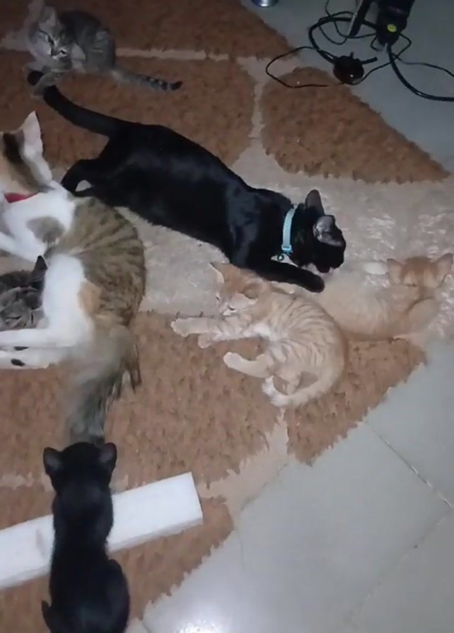 - "group of cats and kittens on a brown patterned rug" by FM-HUOat2, licensed under CC BY 4.0